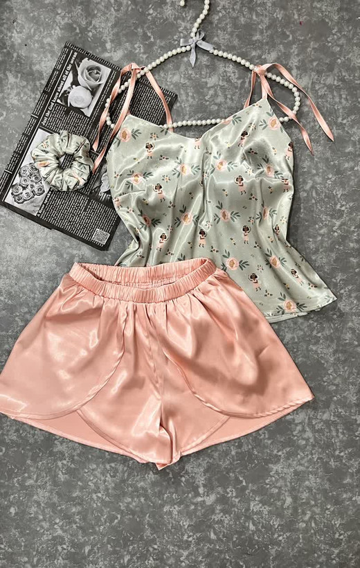 ست ۴ تیکه تاپ و شورتک ساتن پرمه-طرح موآنا همراه با اسکرانچی و بگ طلقی رایگان