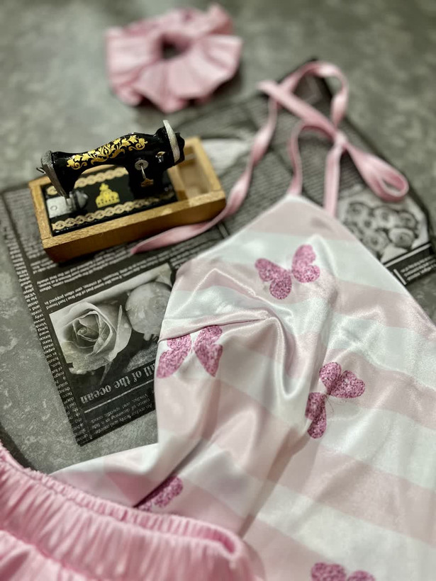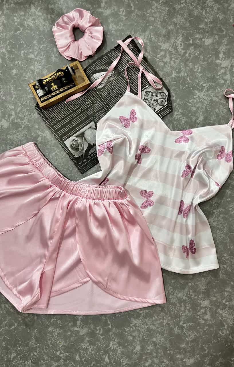 ست ۴ تیکه تاپ و شورتک ساتن پرمه-طرح پروانه صورتی زمینه سفید همراه با اسکرانچی و بگ طلقی رایگان