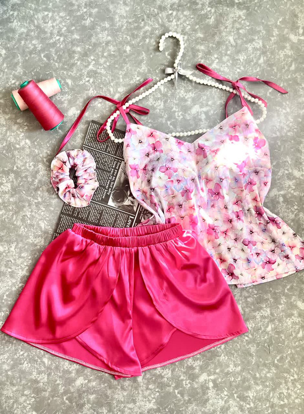 ست ۴ تیکه تاپ و شورتک ساتن پرمه-طرح گل های رنگی همراه با اسکرانچی و بگ طلقی رایگان