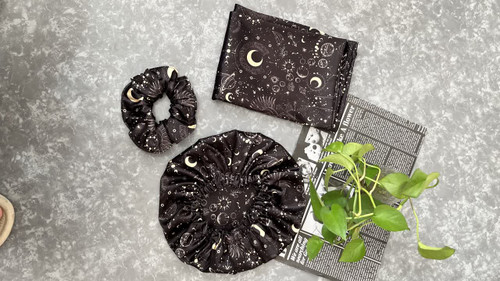 ست کلاه و روبالشی و پاپیون ساتن پرمه-طرح کهکشان مشکی کد۲۲همراه با اسکرانچی و بگ طلقی رایگان