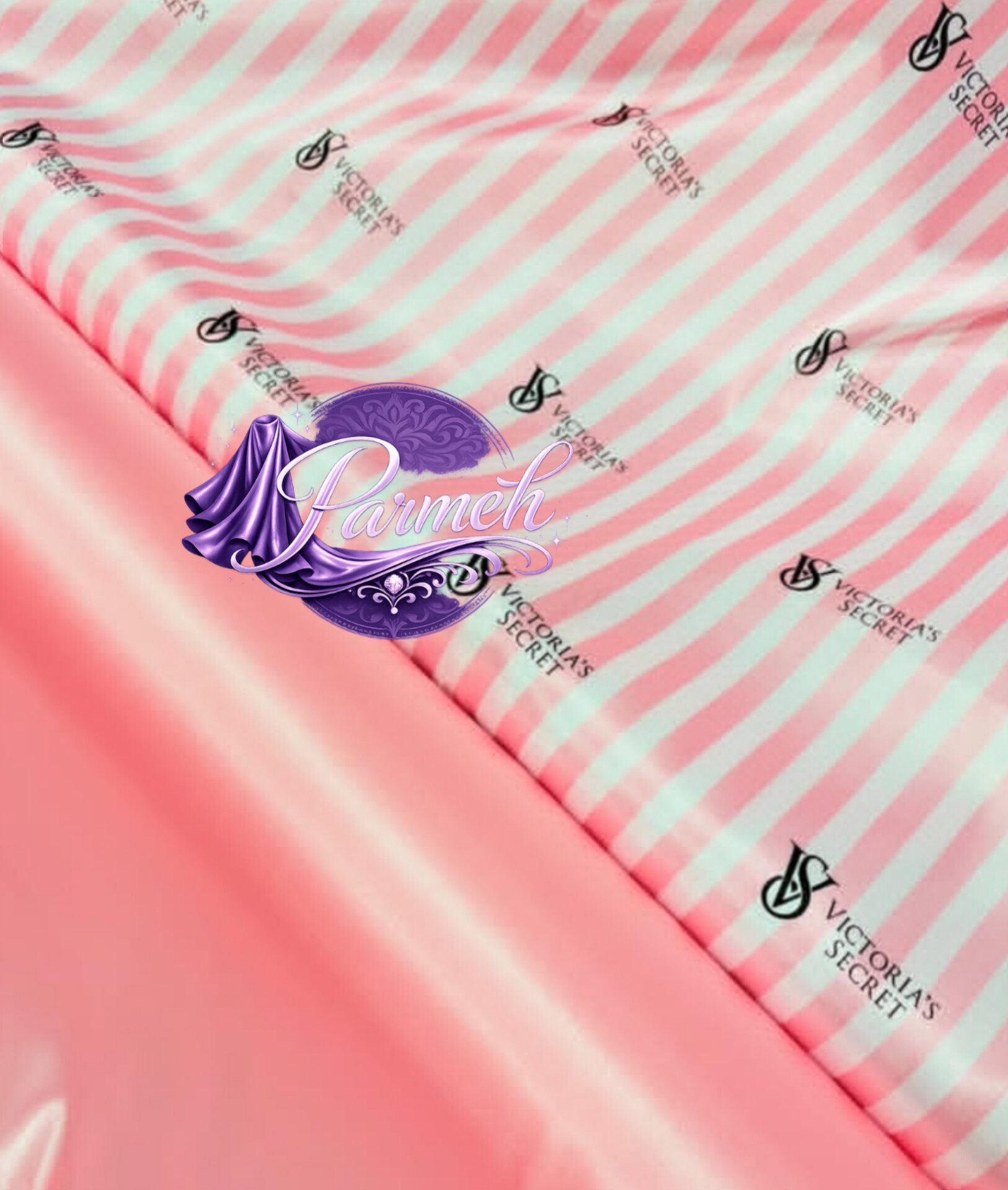 ست ۴ تیکه تاپ و شورتک ساتن پرمه-طرح ویکتوریا سکرت صورتی همراه با اسکرانچی و بگ طلقی رایگان